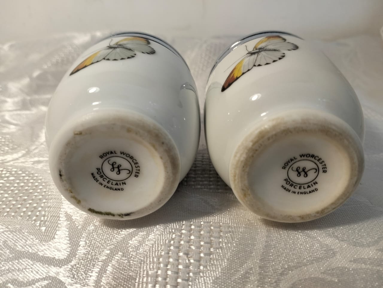 A pair of standard size Royal Worcester porcelain egg coddlers in a berry and butterfly pattern.