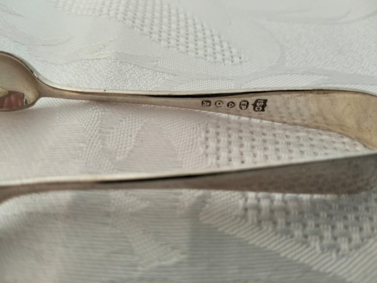 This is a pair of u-shaped sugar tongs or nips. They are stamped “ISG” which likely stands for International Silver Group and are also marked ‘EP’. They are silver-plated, not solid silver, often marked EPNS (Electroplated Nickel Silver) or just EP, indicating a base metal coated in silver.