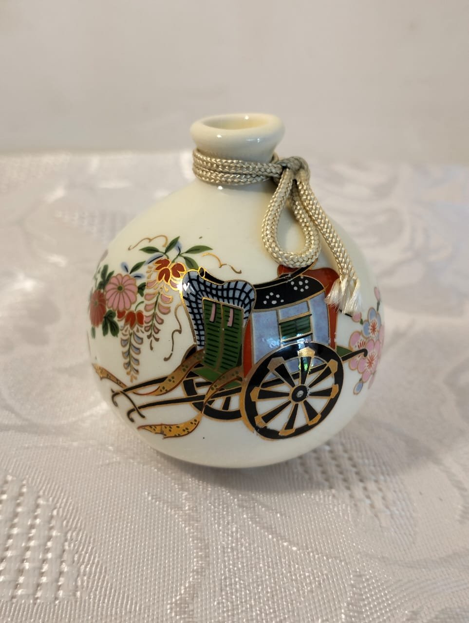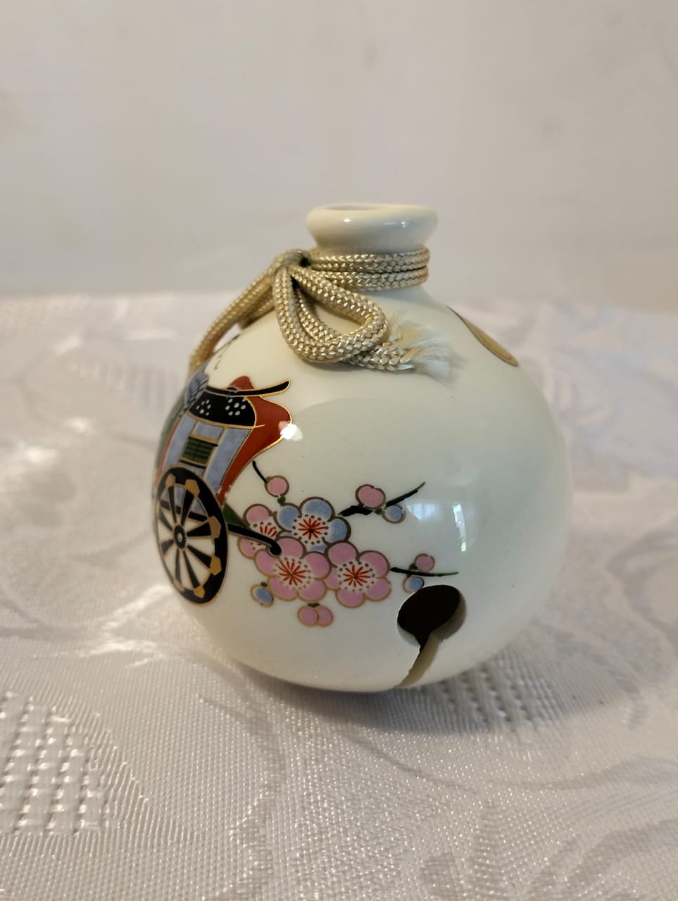 This beautiful little Japanese Kutani-ware ball shaped porcelain bell has a porcelain ball inside and was made in the 1970’s.  It has a lovely hand painted design of a travelling coach and blossoms trimmed in gold on a cream coloured background.