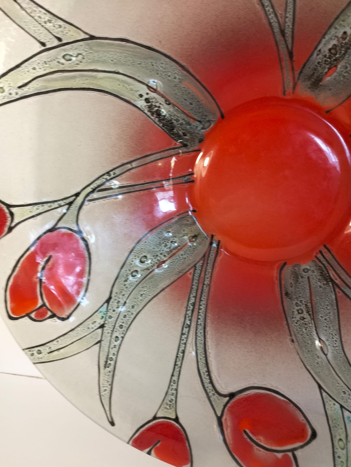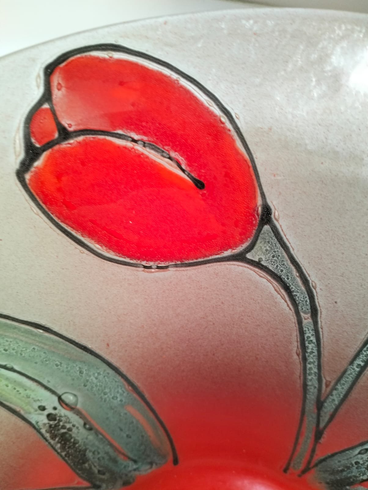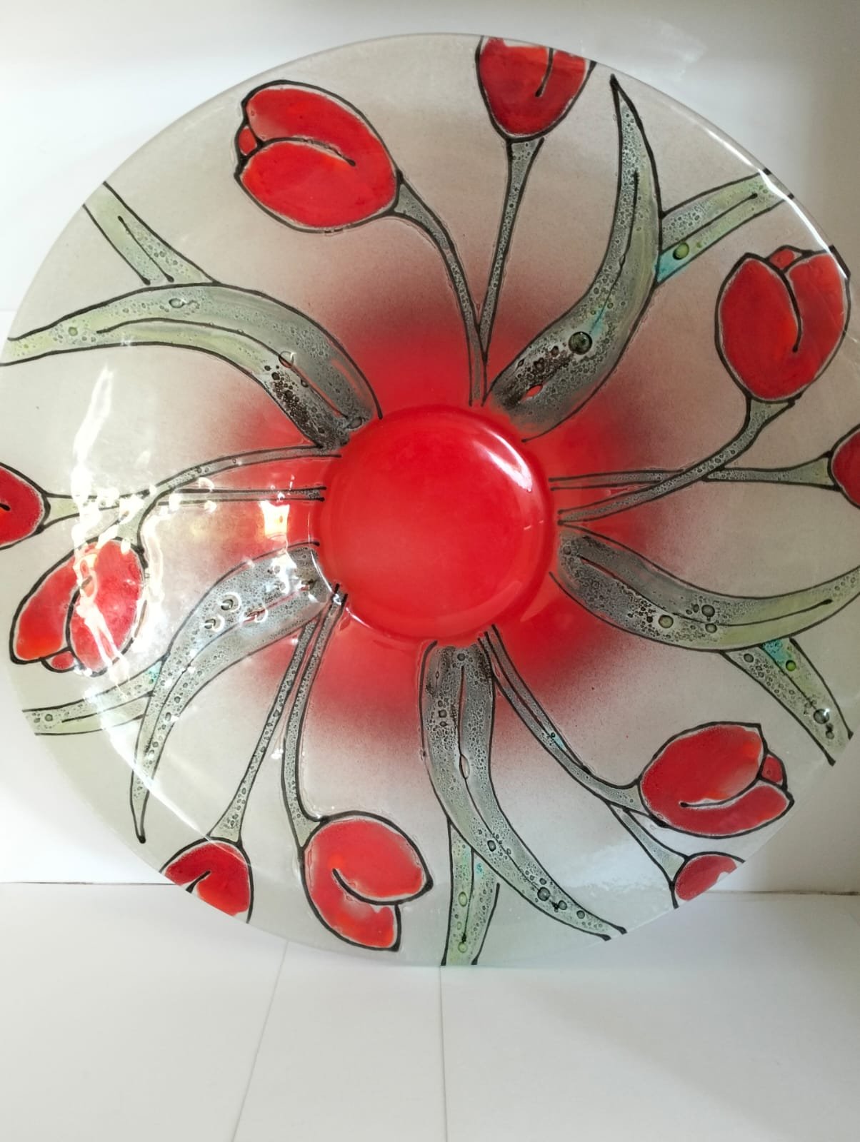 This mid-century modern 1950’s glass bowl measures 40cm in diameter and showcases a beautiful poppy and leaf design.