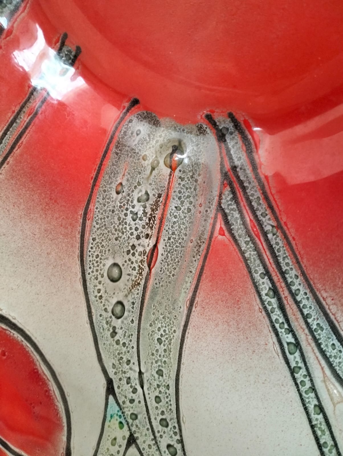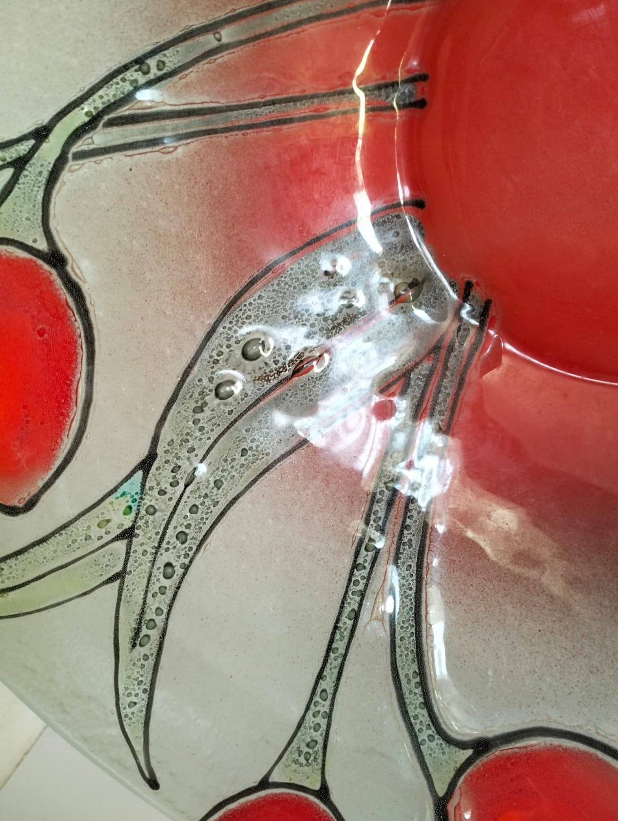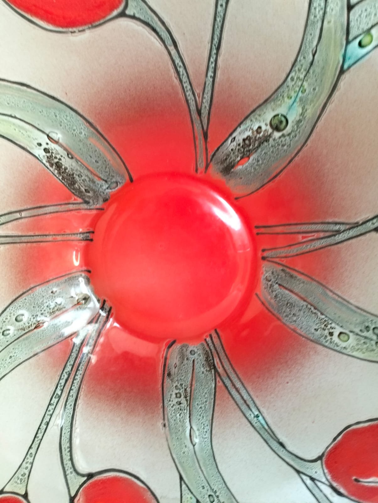 This mid-century modern 1950’s glass bowl measures 40cm in diameter and showcases a beautiful poppy and leaf design.