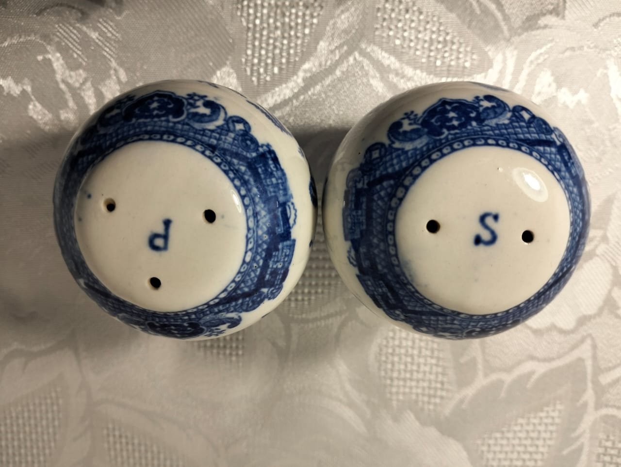 Each shaker is marked with a “P” and “S” on top and features the traditional oriental-inspired Blue Willow pattern with birds, pagodas, and trees.