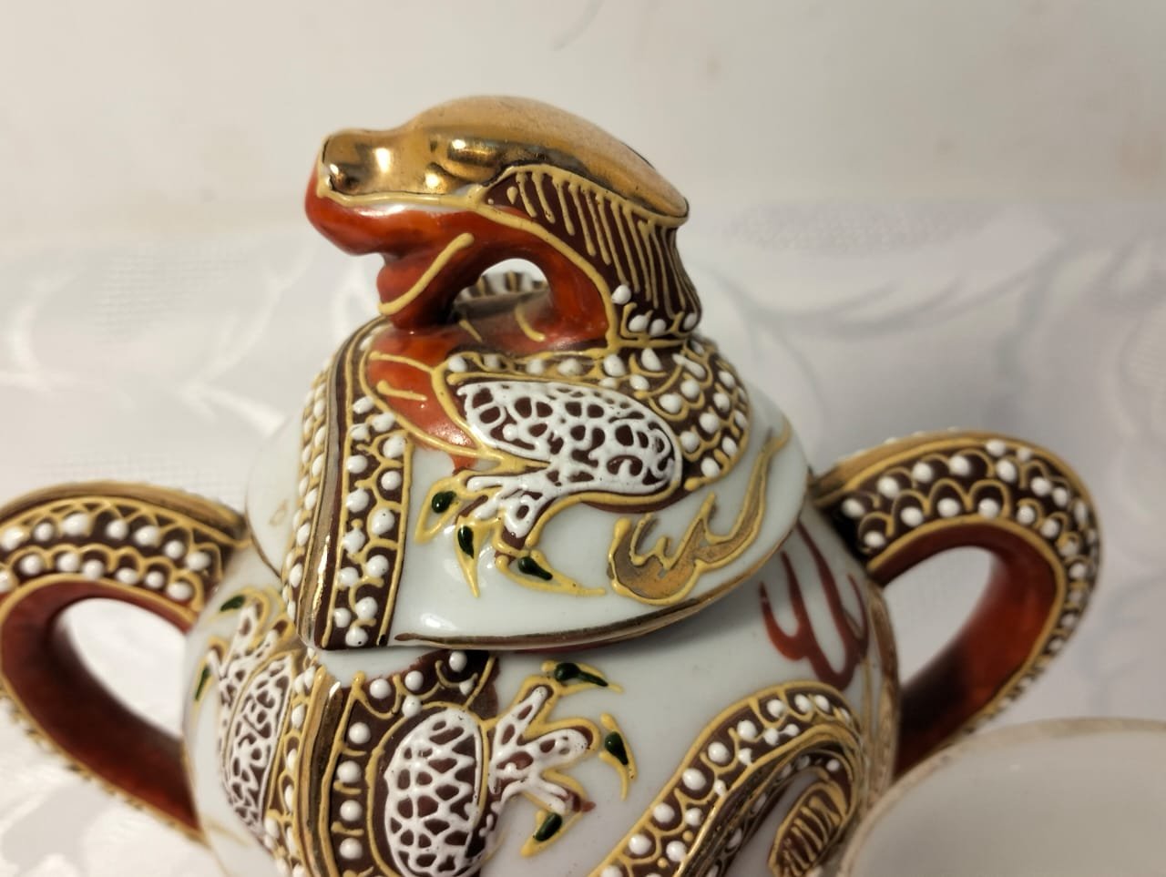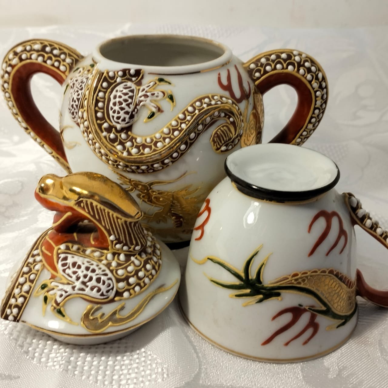 Vintage Japanese Moriage Dragonware Sugar Bowl with Lid. This striking vintage Japanese sugar bowl features the classic Moriage Dragonware design, renowned for its raised enamel decoration and dramatic hand-painted detailing. The piece is adorned with a finely textured dragon motif in rich tones, accented with traditional moriage (raised slip) technique that adds depth and tactile appeal. Gilt highlights enhance the design, giving the bowl a luxurious, ornate finish. VALUE: R500,00