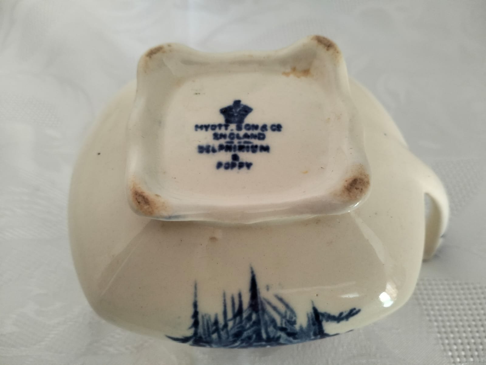 Vintage creamer, platter and serving bowl made by Myott Son & Co, Staffordshire. Excellent vintage condition with no cracks or crazing. There are a few wear marks on the inside of the jug, and on the underneath of the bowl and platter. The trio dates from the 1930’s The design is “Delphinium & Poppy” and each piece is stamped on the bottom “Myott Son & Co, England – Delphinium & Poppy”. All three pieces have a distinctive scalloped and moulded rim. An unusual and rare find in very good condition considering the age. Ideal for collectors.