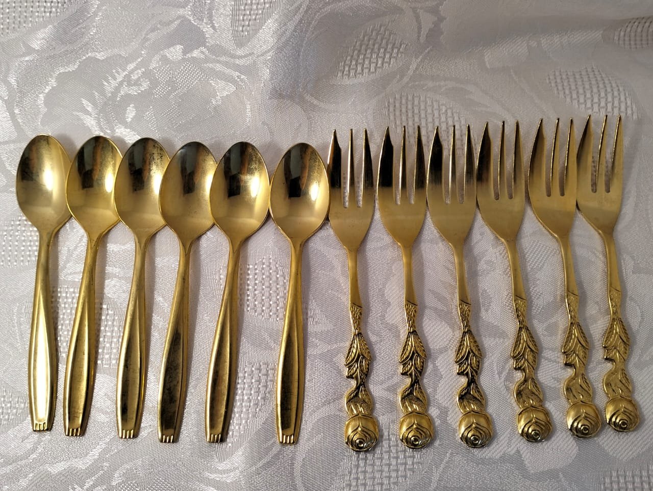 Up for sale is a mixed set of 6 x 24K gold plated cake forks and 6 x 23K gold plated teaspoons.