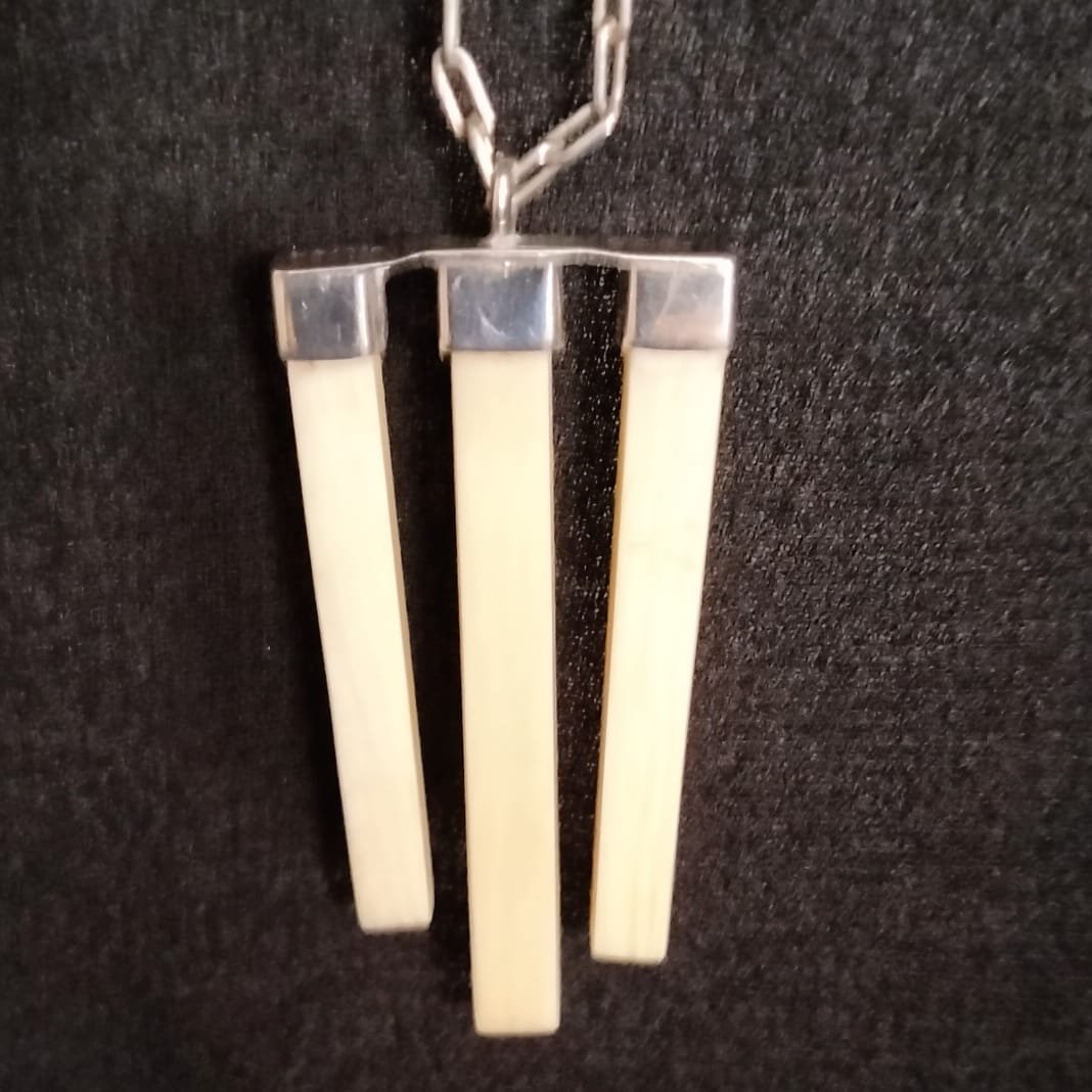 This exquisite necklace pairs gleaming sterling silver with a beautifully aged ivory element, creating a piece that radiates timeless sophistication. The smooth ivory centerpiece—cherished for its warm, natural tone—contrasts elegantly with the refined shine of sterling silver, resulting in a necklace that feels both classic and unique.