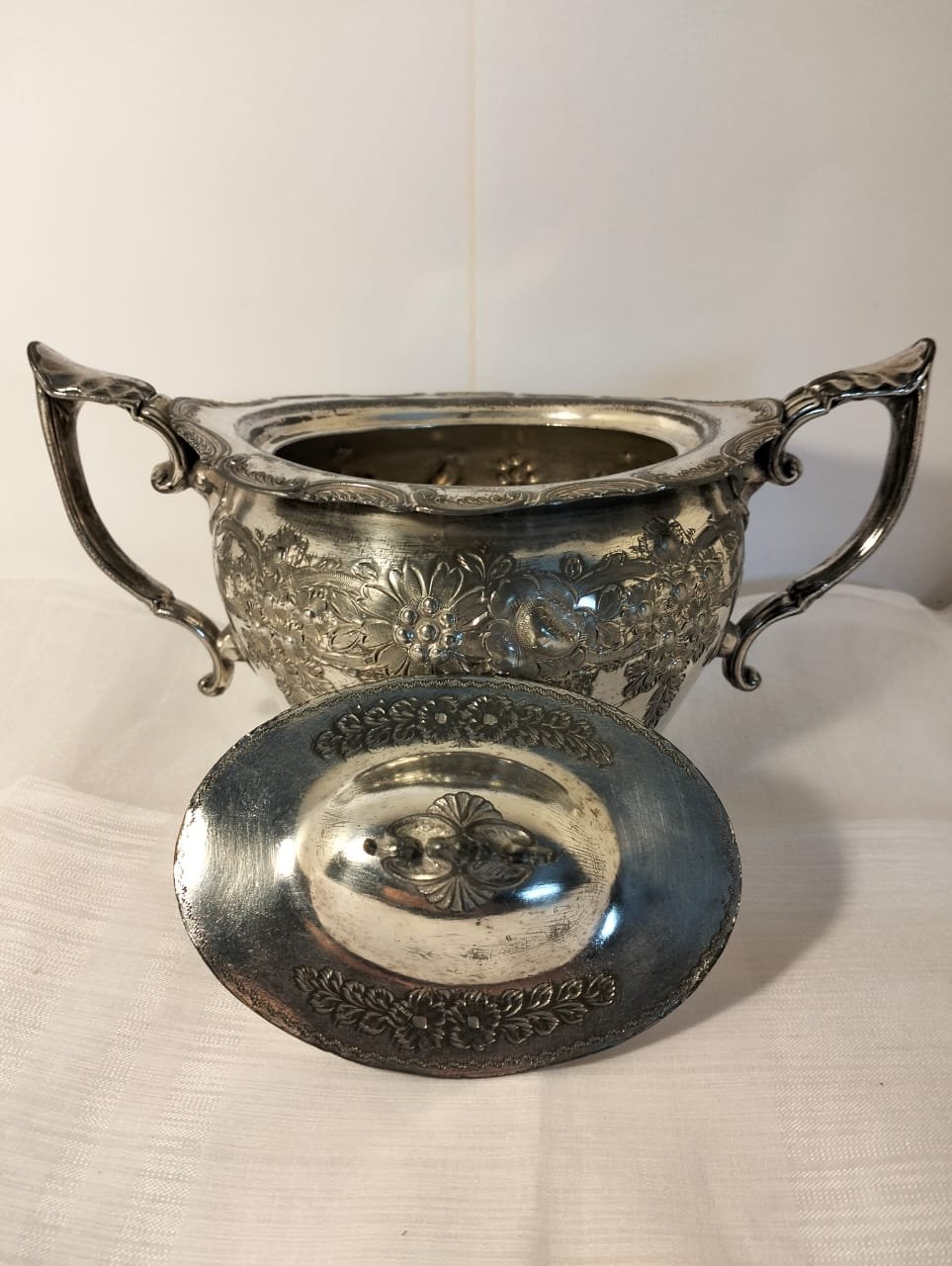 While visually elegant, it is considered softer than other metals. Antique sets frequently show wear where the silver plating has thinned. This is the case with our 3 piece set.
