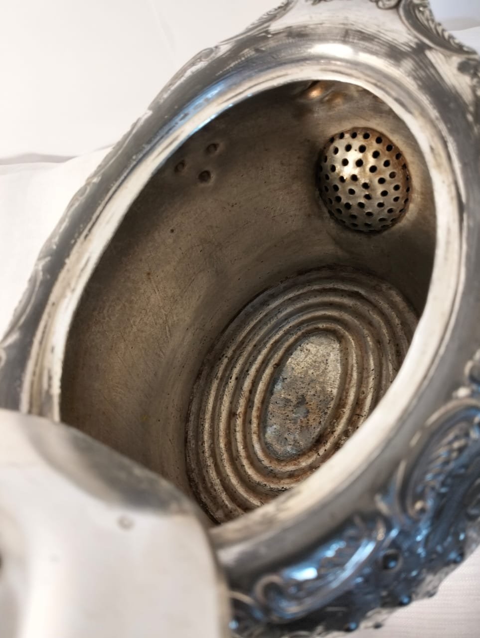 It has ornate styling and wonderful chased floral patterns but the silver plating has worn through quite extensively.