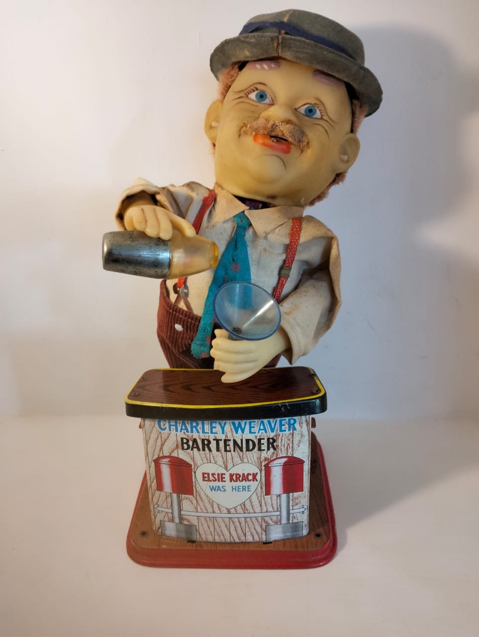 The phrase “Charley Weaver bartender Elsie Krack was here” refers to a popular vintage, battery-operated, tin litho toy from the 1960s, made in Japan. This collectible toy features an animatronic bartender who “mixes” drinks, and the “Elsie Krack was here” inscription is a humorous tag on the base, not directly connected to a real person named Elsie Krack. The original character, Charley Weaver, was created by actor Cliff Arquette for television in 1959..