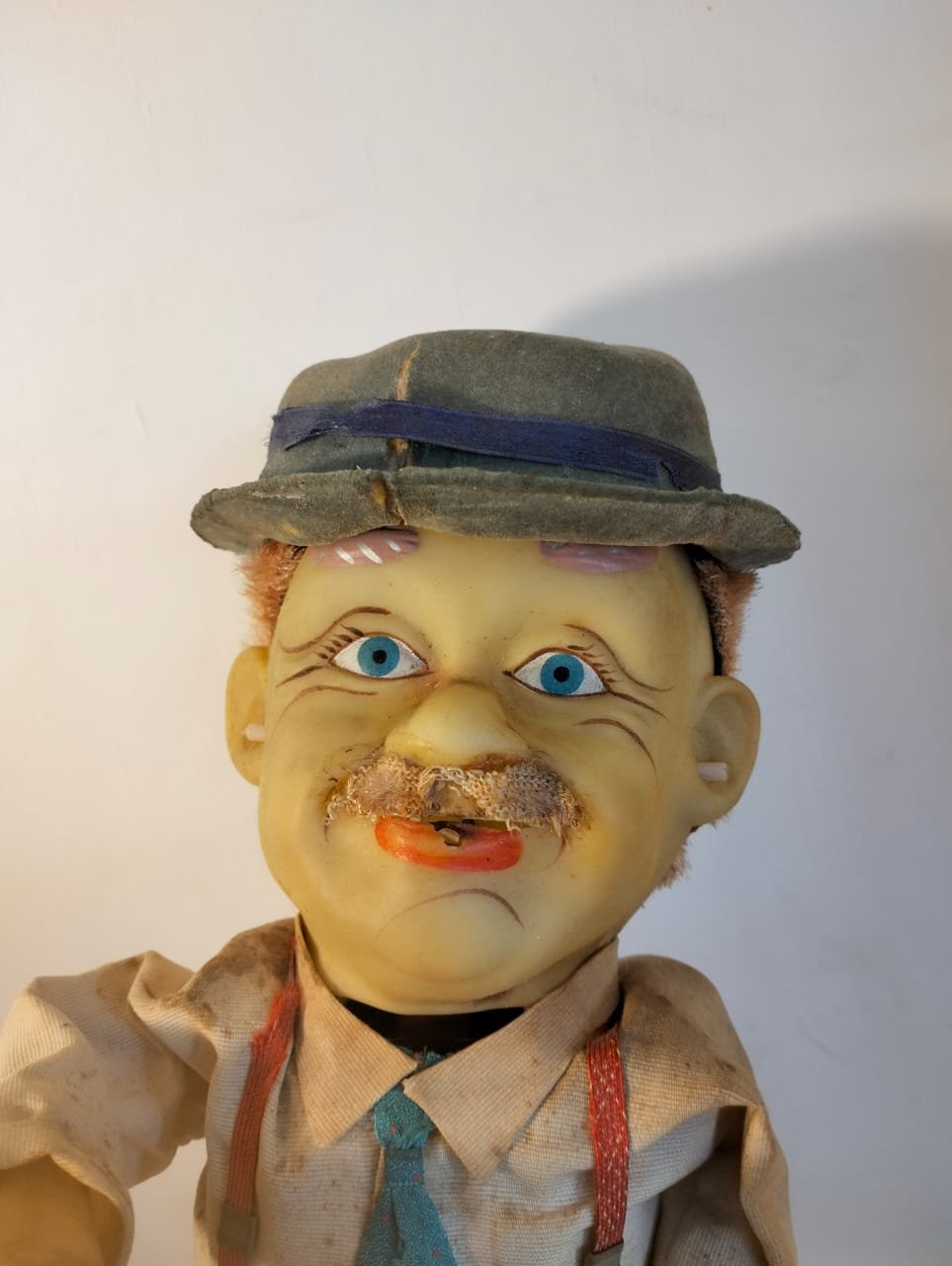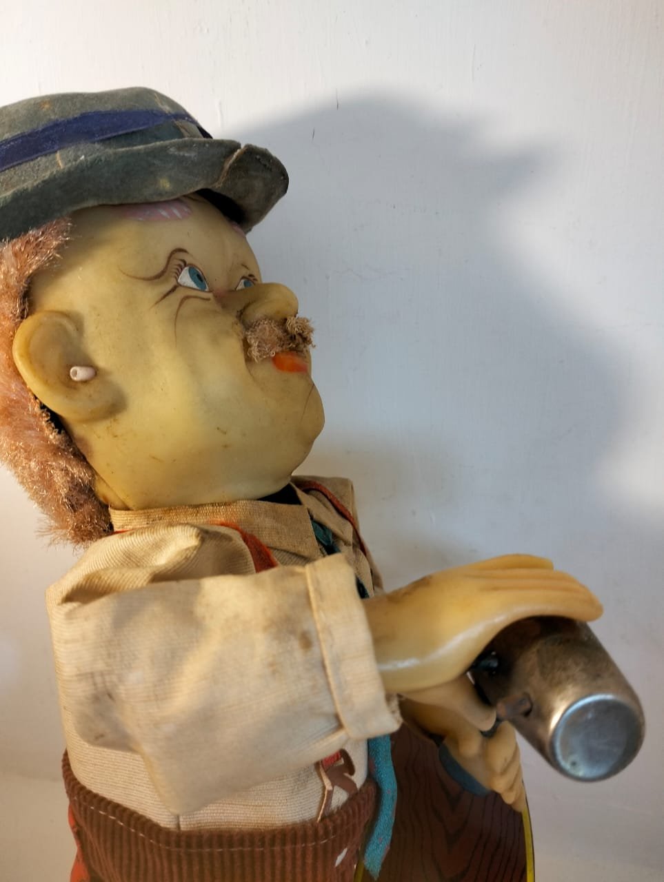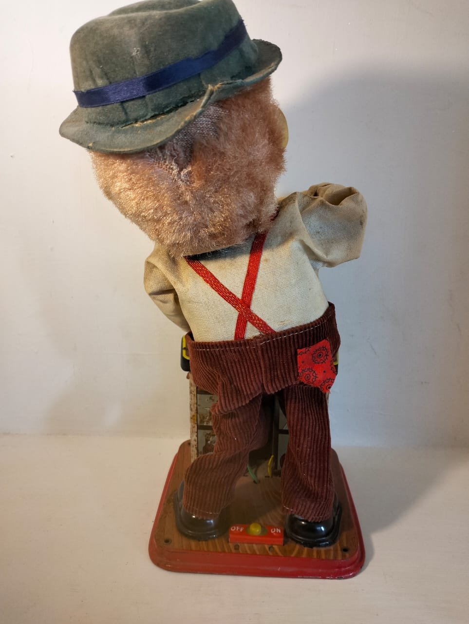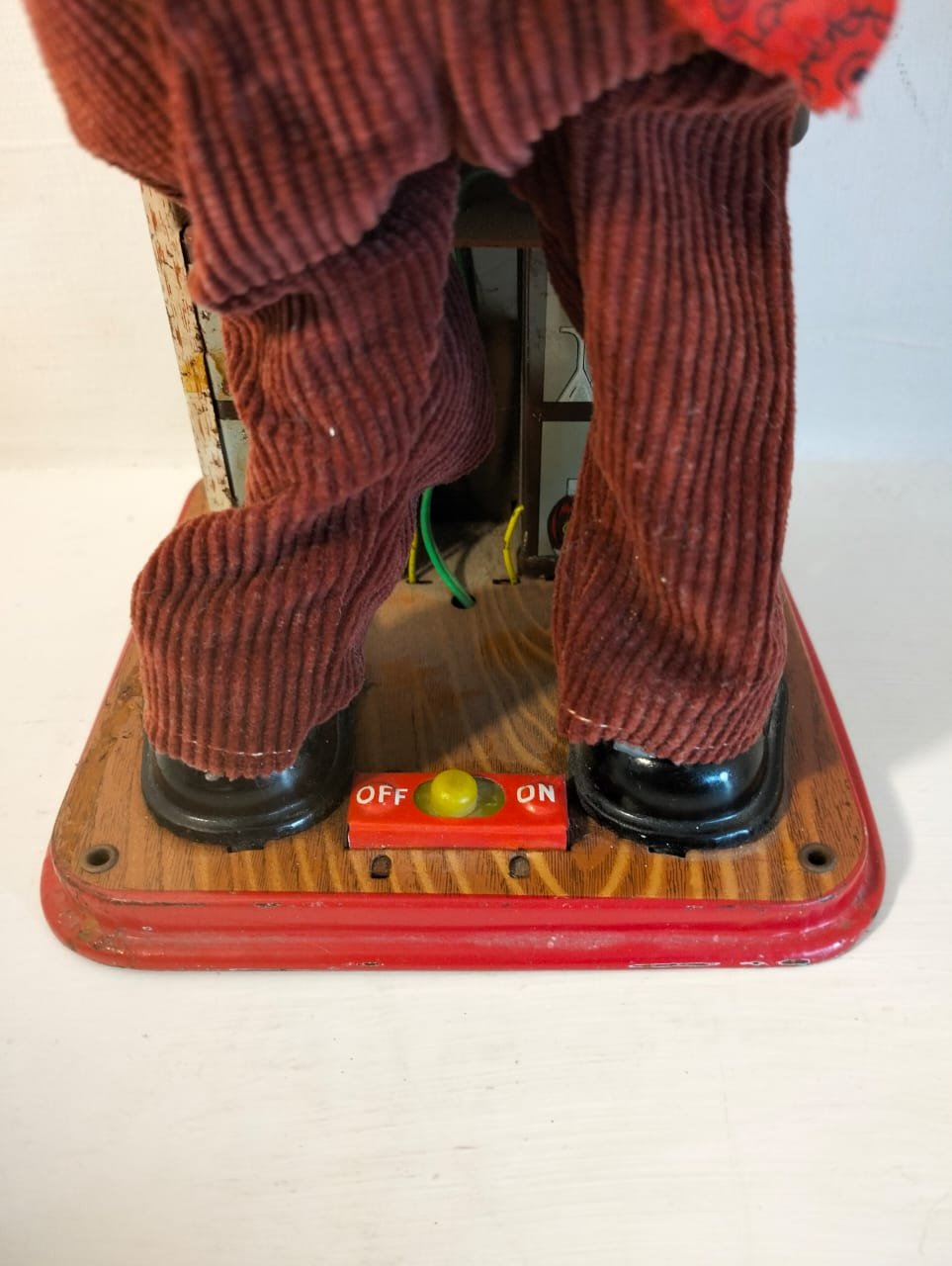 Rare find, working condition. Lights up and moves perfectly! A bolt holds the lid for the batteries. Sadly Charlie’s outfit can be described as dirty and the whole toy looks somewhat scruffy. This is from age and use. However, it works!! Made in Japan by TN (Toys Nomura)