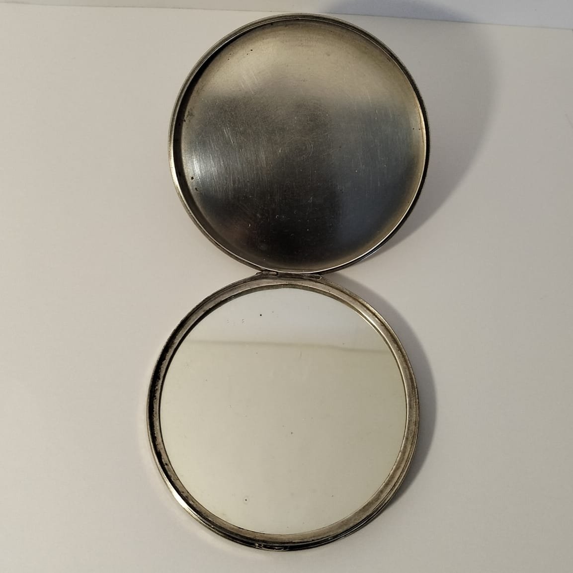 The powder compact is in good vintage condition with minimal wear to the silver plate. It is, however, missing its powder sifter inner. It has a reflective mirror and the base has one pin sized ding. The hinged lid works but doesn’t close completely.
