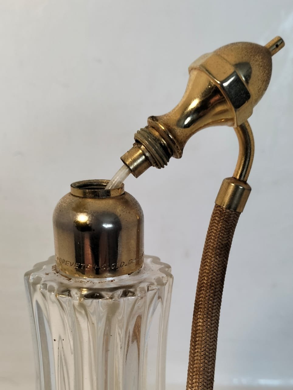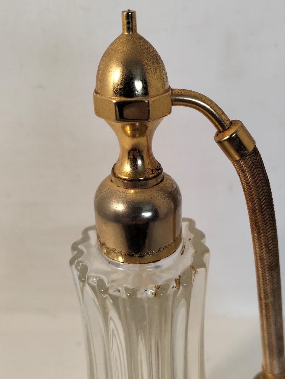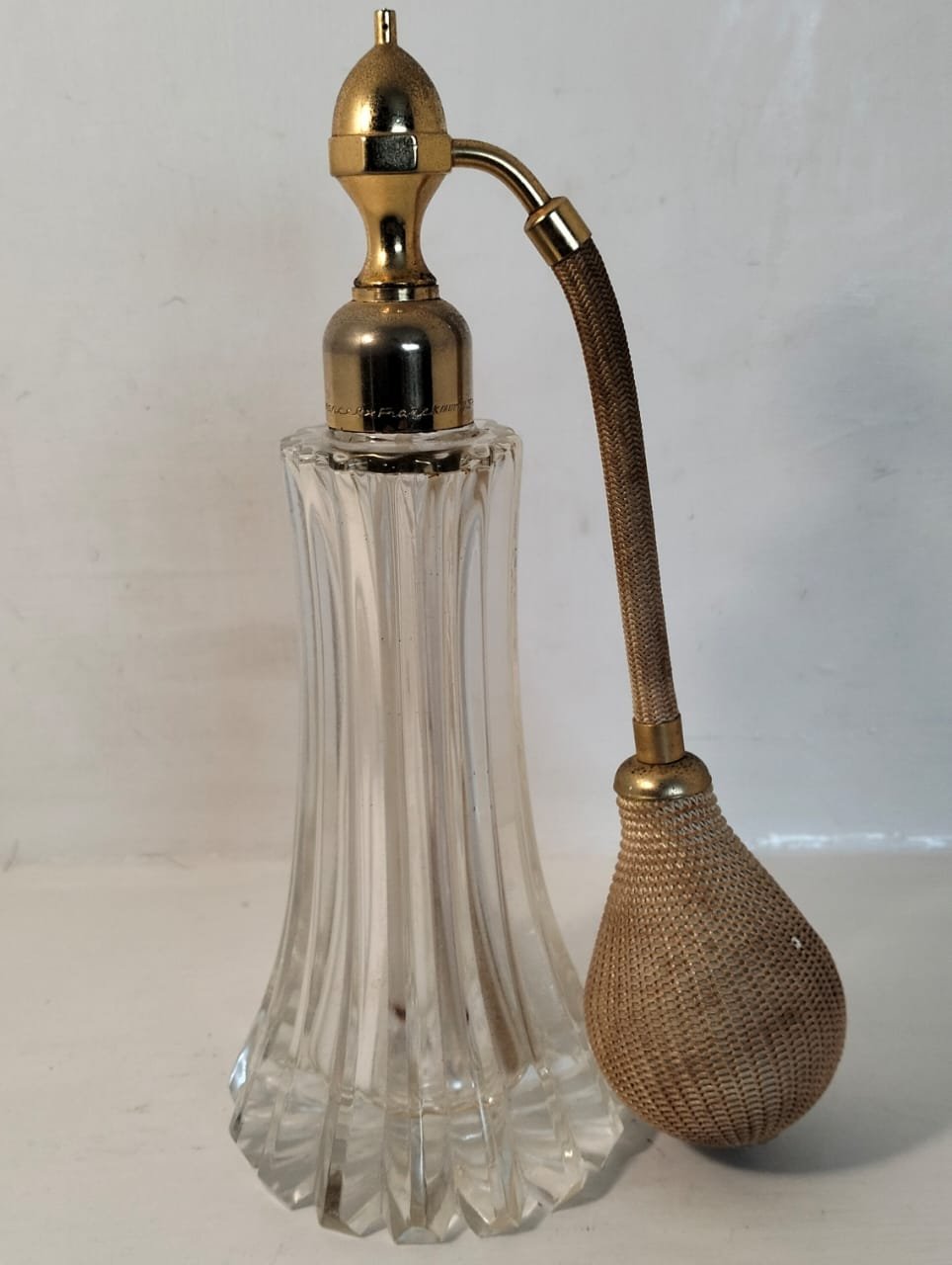 This vintage gold plated crystal perfume bottle with atomiser is stamped ‘Marcel Franck Brevete SGDG Made in France”. The bottle is ribbed with an elegant wide base and narrow neck.