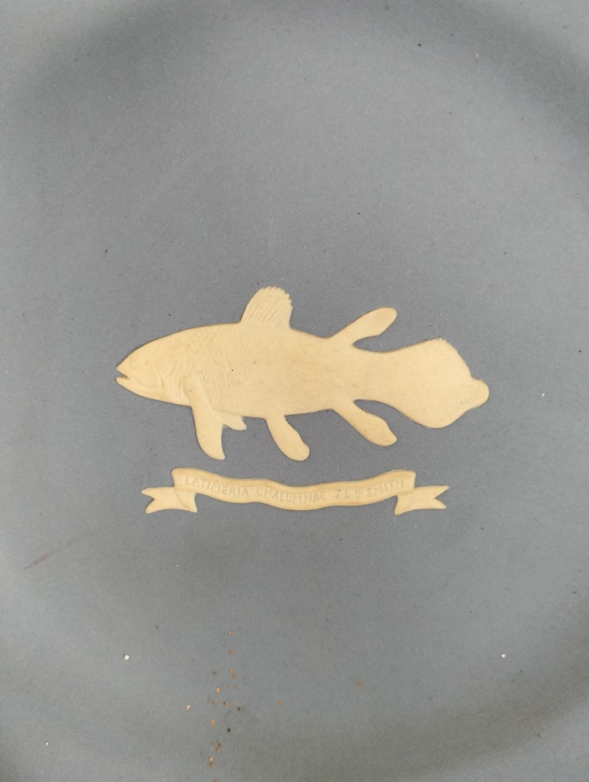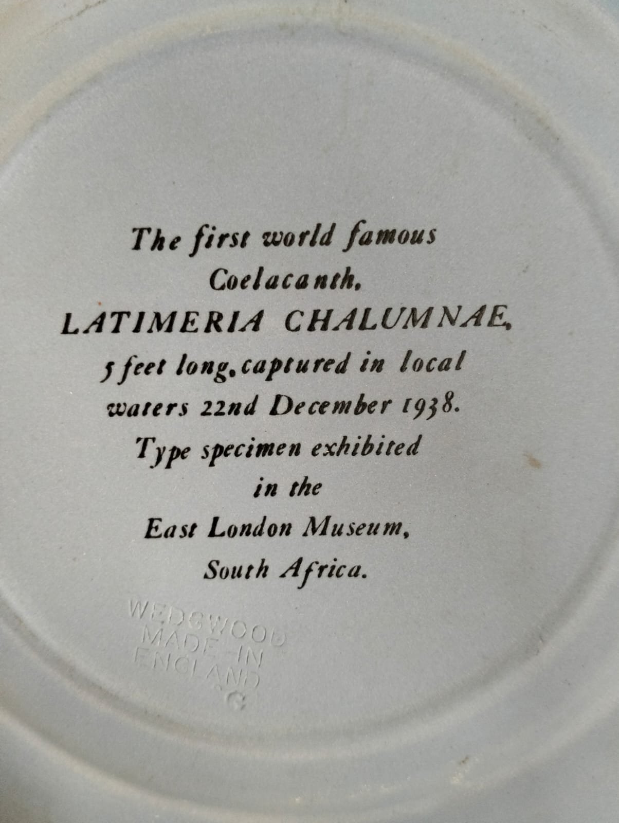 “The first world famous Coelacanth, LATIMERIA CHALUMNAE, 5 feet long, captured in local waters 22nd December 1938. Type specimen exhibited in the East London Museum, South Africa.”