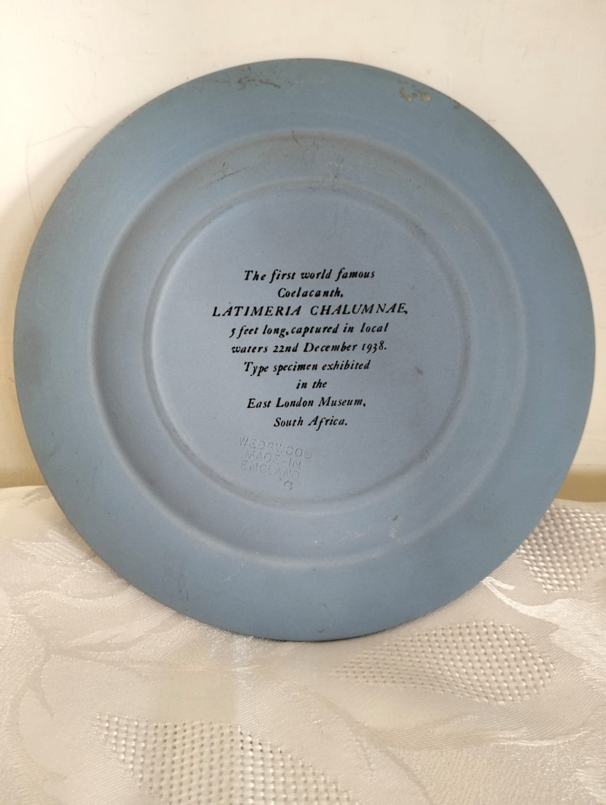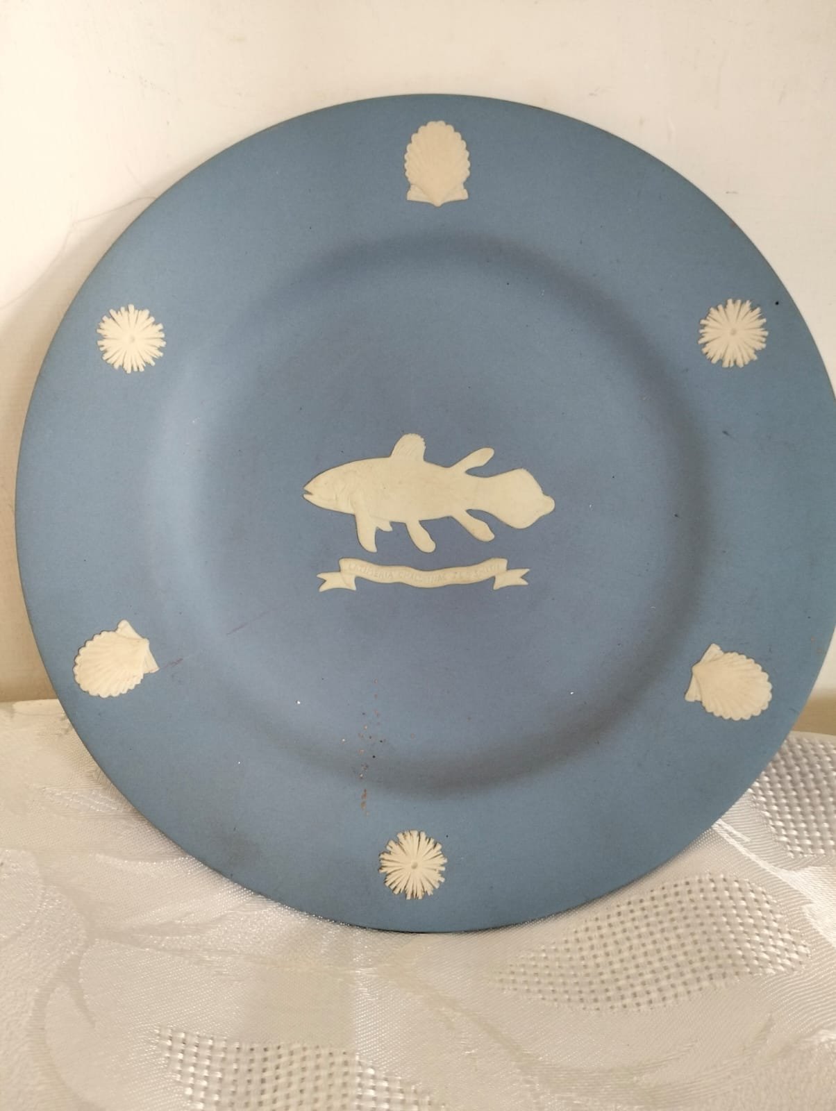 This unusual Wedgwood Jasperware plate was made to commemorate the discovery of the Coelacanth. It is in the traditional Wedgewood blue with the detailed white relief for which Wedgwood is famous.